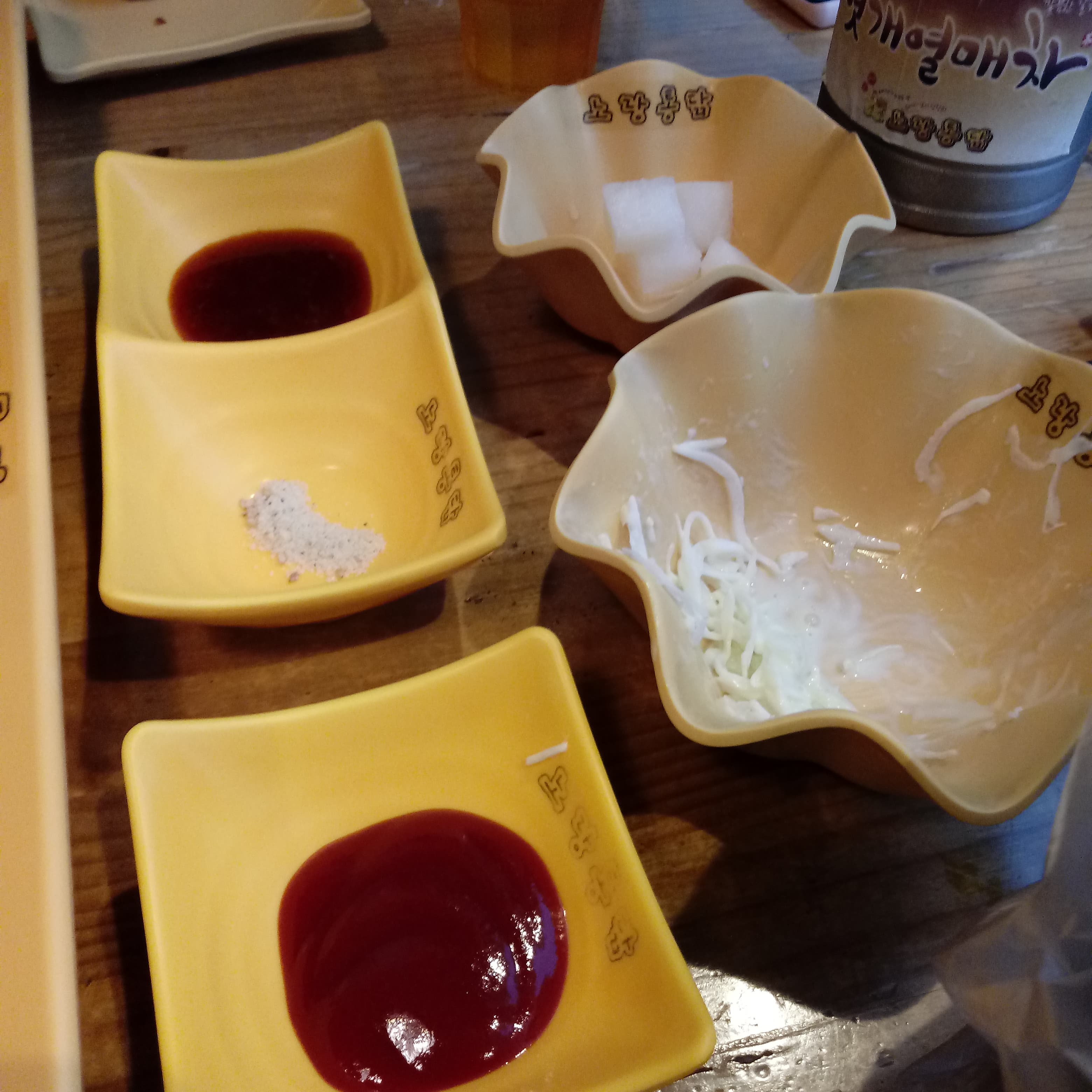 후라이드치킨에 찍어 먹을 소금과 약간의 양념, 무, 샐러드가 같이 나옵니다.