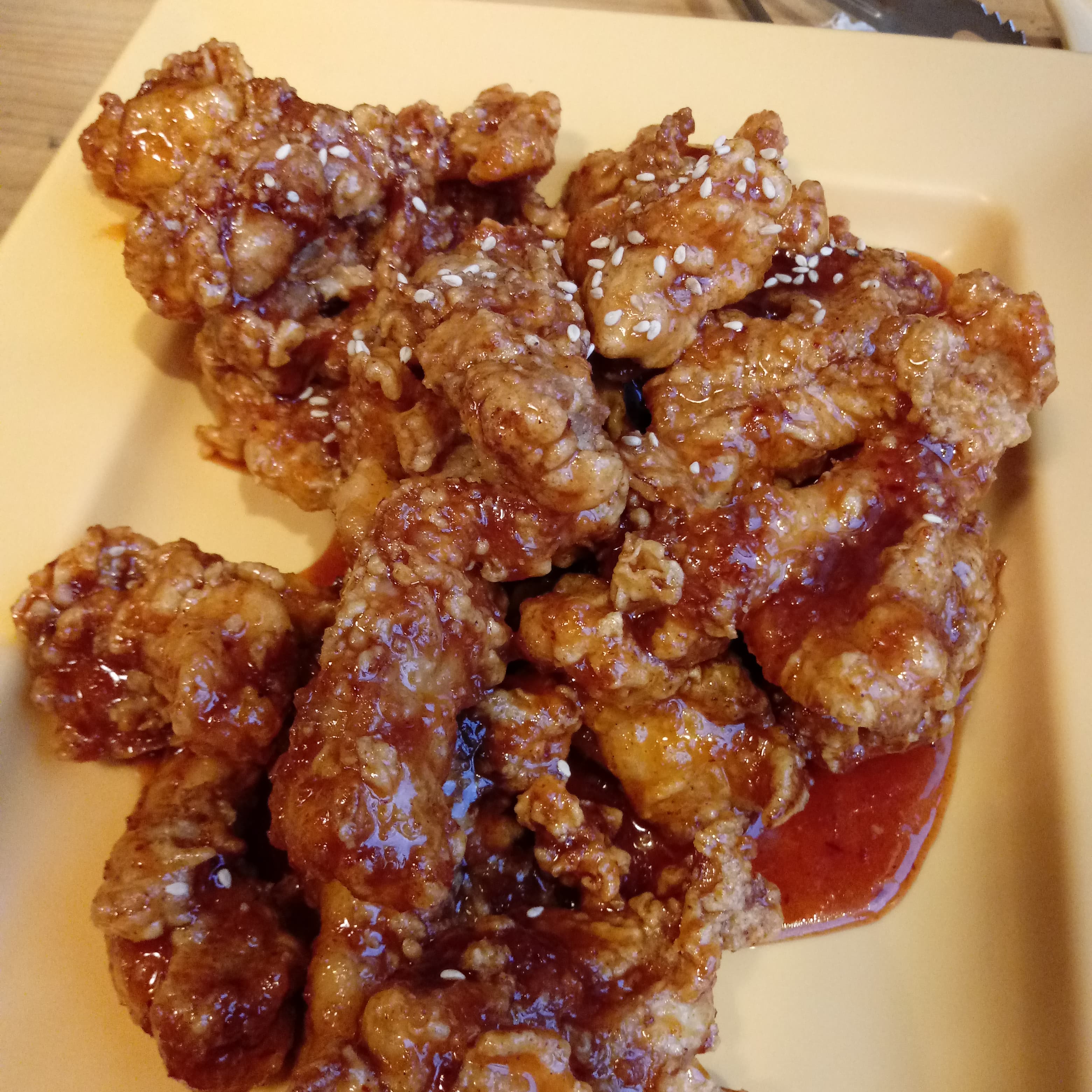 양념치킨입니다. 윤기가 좔좔 흐르는 게 너무 맛있어 보였습니다. 하지만 양이 좀 부족하다는 생각도 들었습니다.