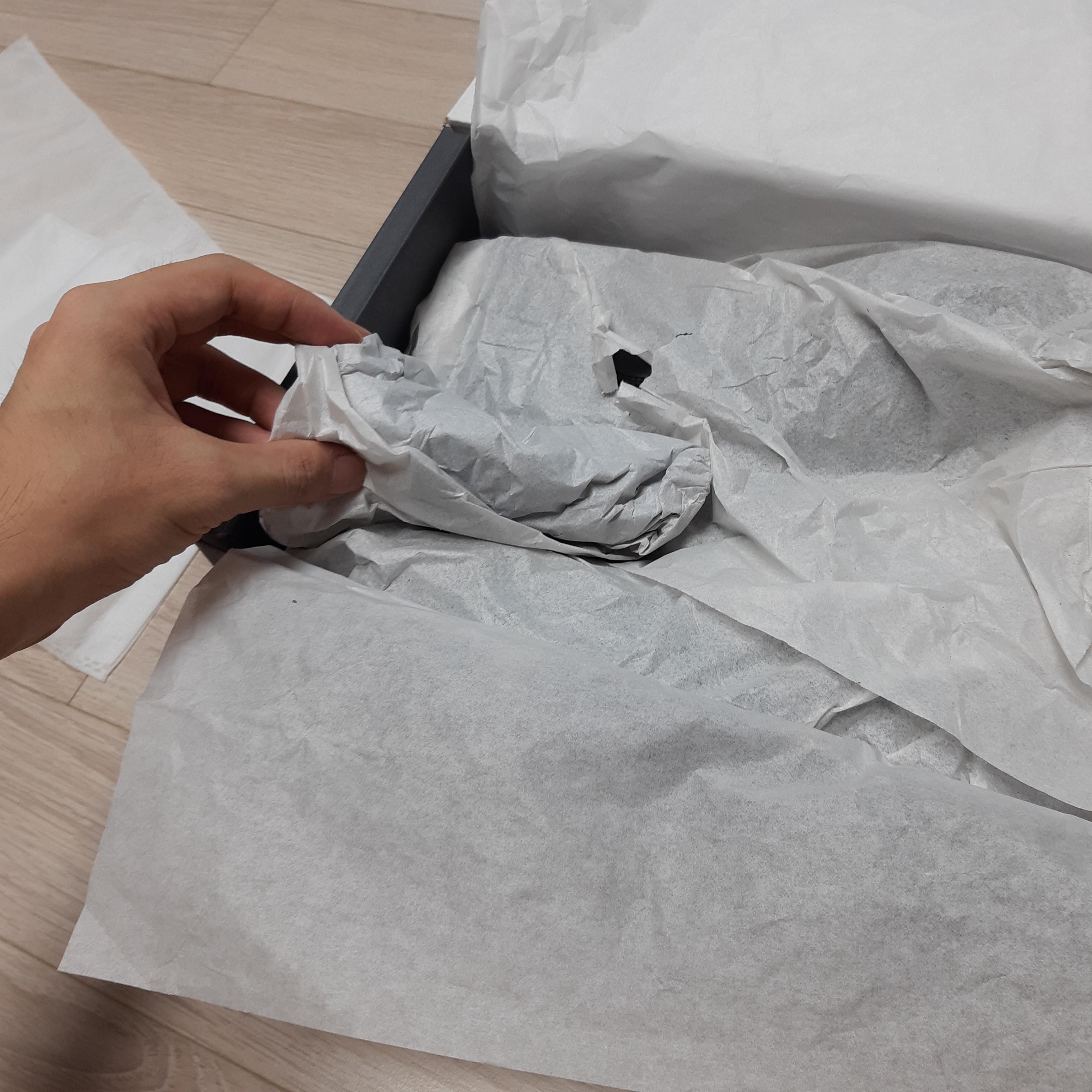 상자 안에서 신발에 서로 충격이 안 가도록, 신발 코 부분 빈 공간들에도 완충 종이가 채워져있습니다.